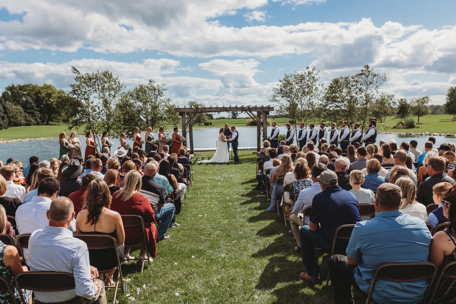 Here at Buechler Farms we offer your dream venue for your perfect day! Situated not too far from Lake Michigan, The Barn @ Buechler Farms is the ideal countryside location to celebrate your wedding day. This over 100 year old wood barn has been beautifully renovated to serve as a premier wedding venue. The large main room features a vaulted ceiling with exposed beams and is appointed with elegant chandeliers and white twinkling lights. A beautiful large deck awaits guests as they walk out the doors, providing lovely views and a garden patio below. You have the option of having your wedding in the barn, or out on the peninsula of the pond, or in the pavilion. Your event will include the use of our granary for the caterer, indoor and outdoor bathroom facilities, an impressive bridal suite, and a groomsmen suite for the guys. There is also a beautiful courtyard with a waterfall where people can interact with our farm pets right next to our spacious covered pavilion. We provide ample parking and plenty of countryside photo ops.